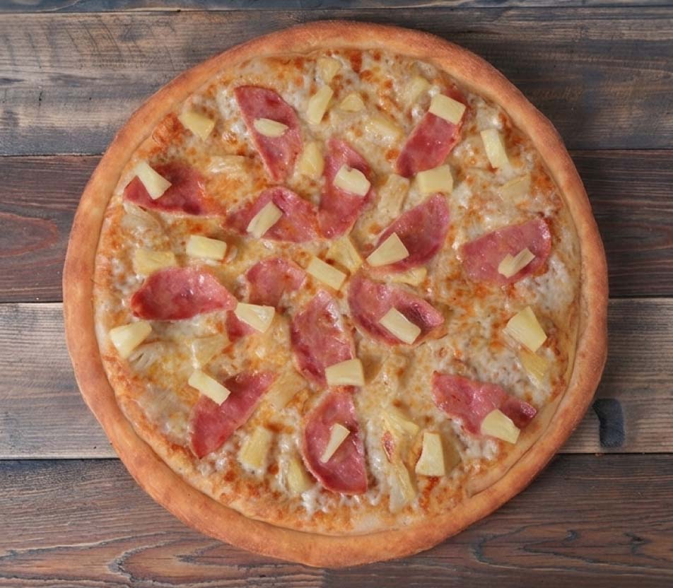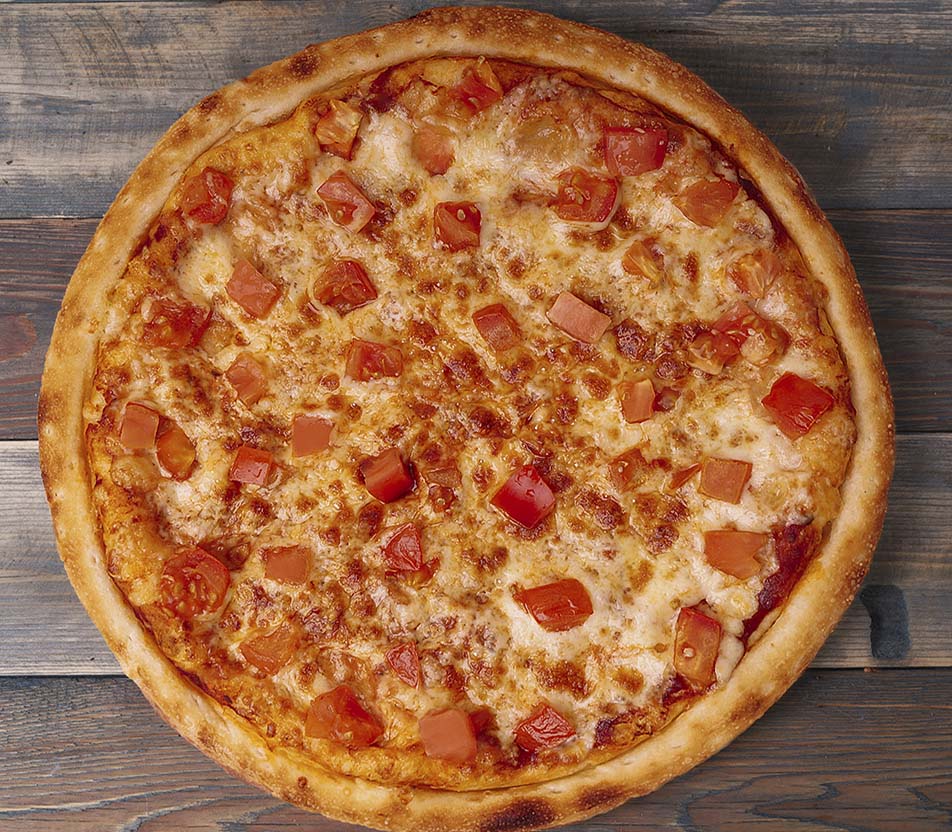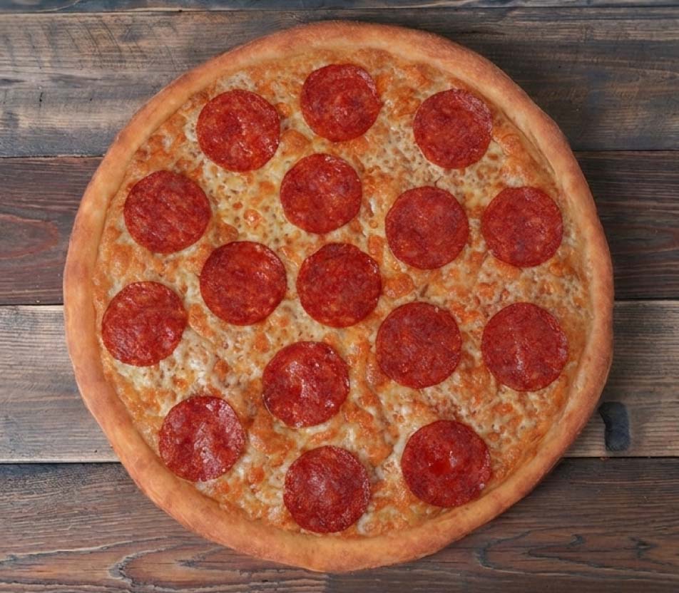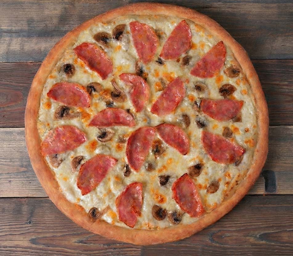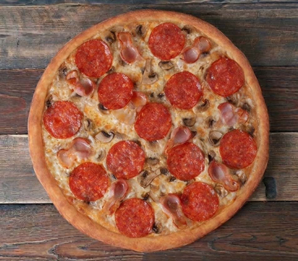 Фирменный пицца-соус, сыр моцарелла, шампиньоны, бекон, пикантная пепперони
