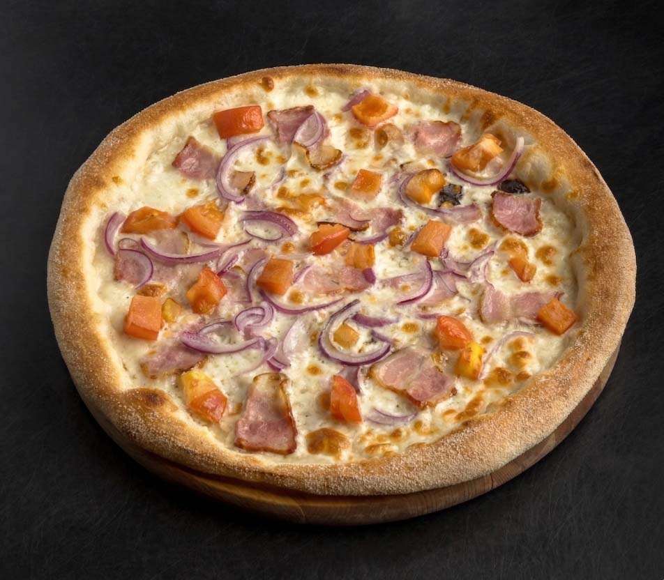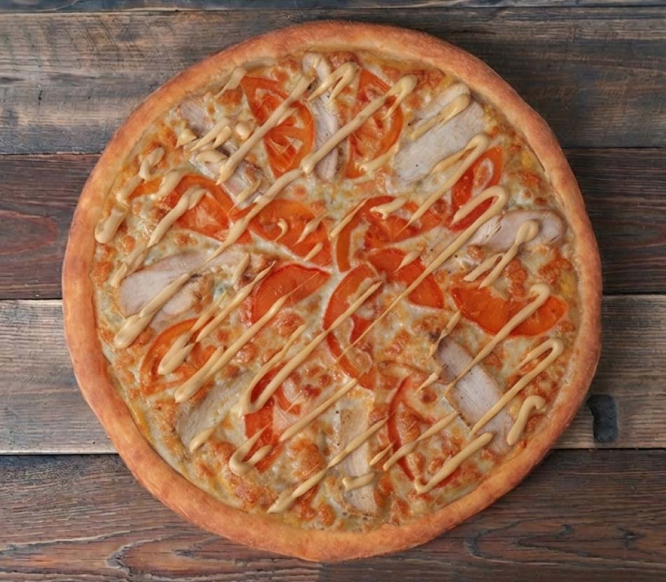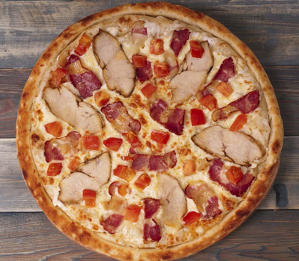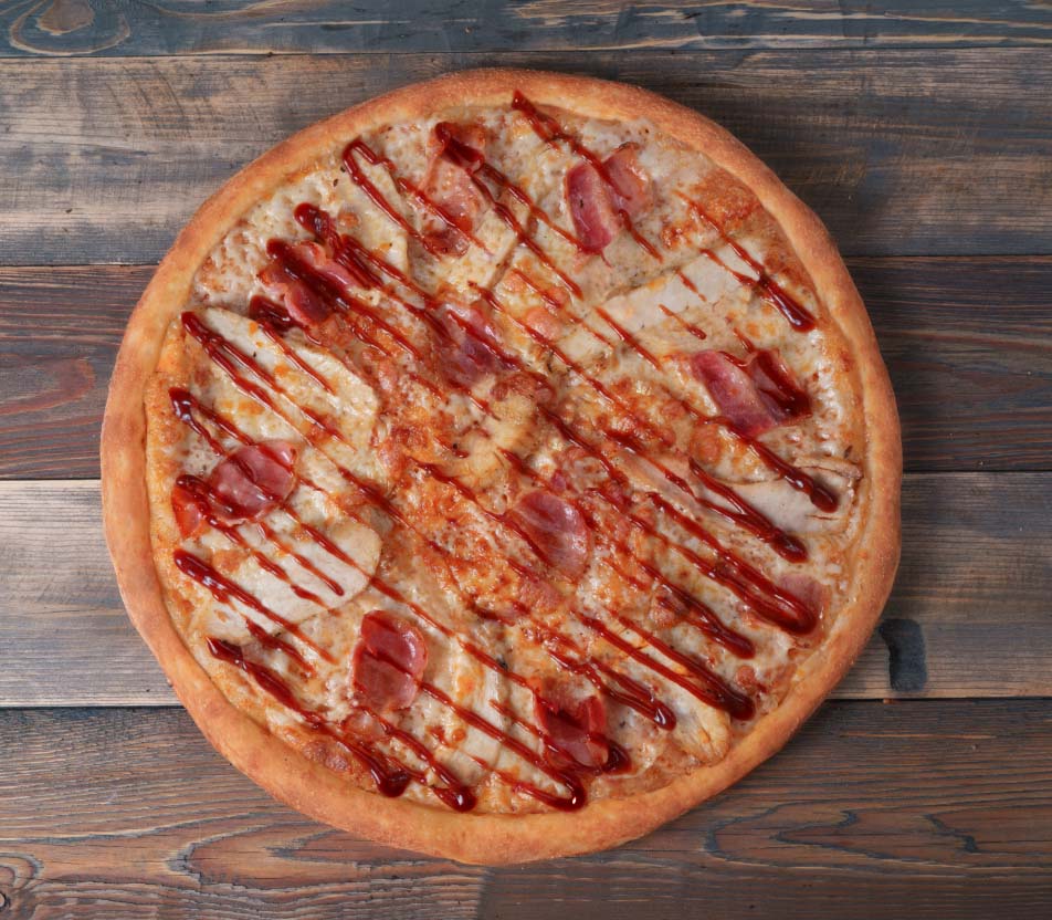 Фирменный пицца-соус, сыр моцарелла, копченая курочка, бекон, соус барбекю