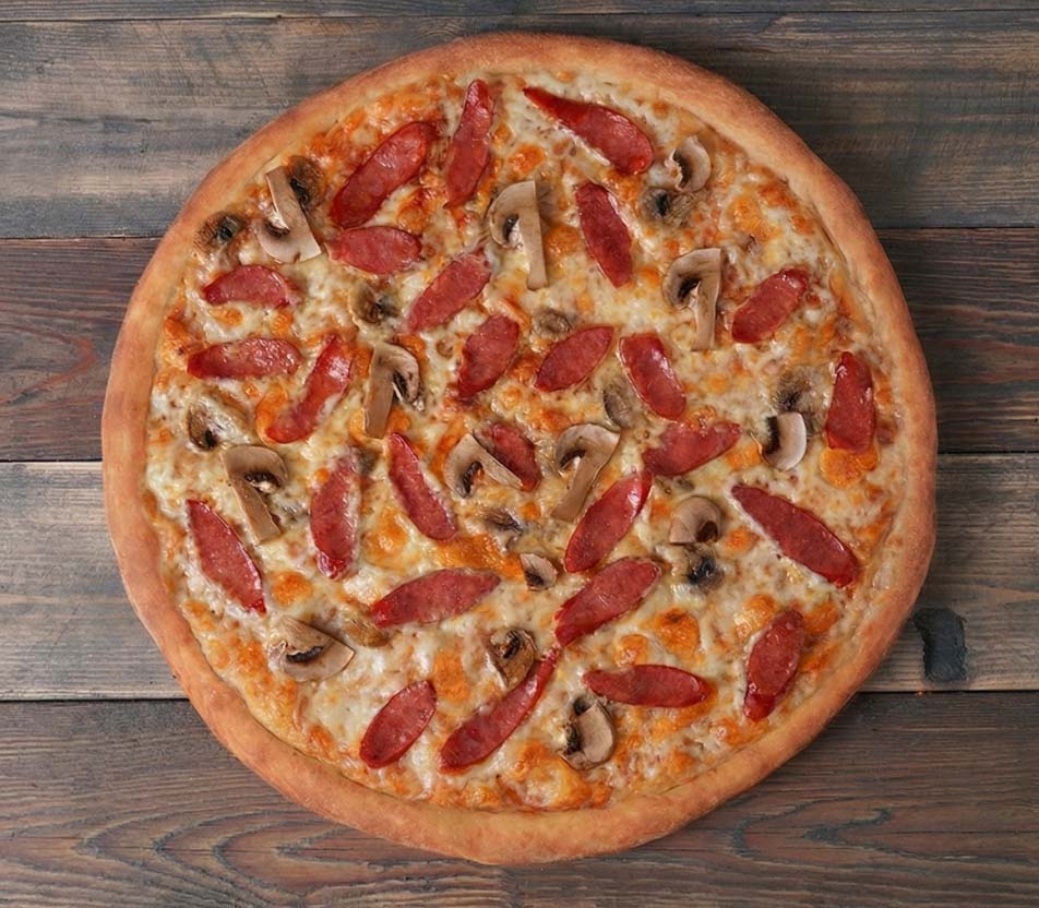 Фирменный пицца-соус, сыр моцарелла, охотничьи колбаски, шампиньоны
