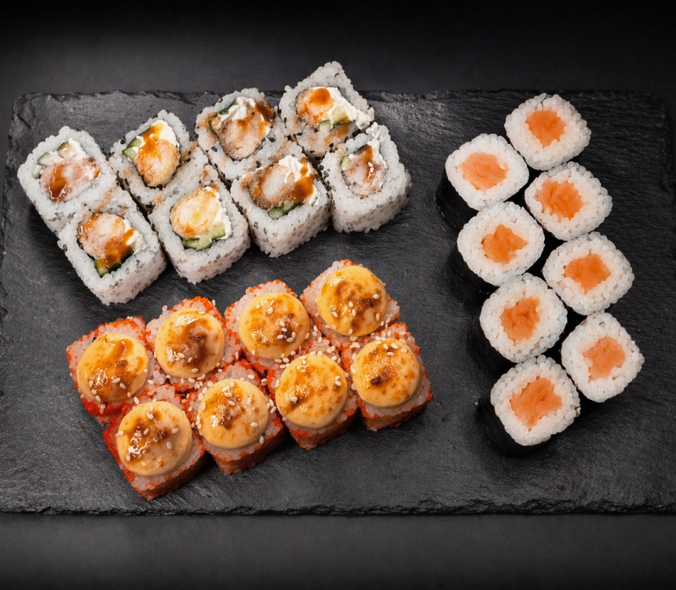 Филадельфия Лайт, Эби Темпура, Лосось Темпура, Калифорния Креветка, Лава Хот, Лосось Хот Спайси